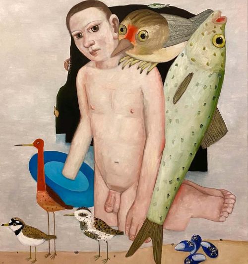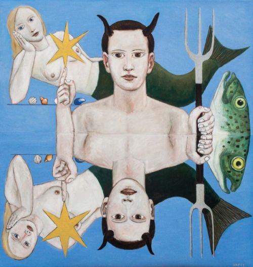 Obrazy a kresby jsou plné severských mýtů a pohádek, ryb, krabů