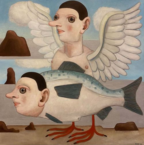 postavy lidské i andělské, ovoce a ryby a cvrlikají ptáci. Vše plave v