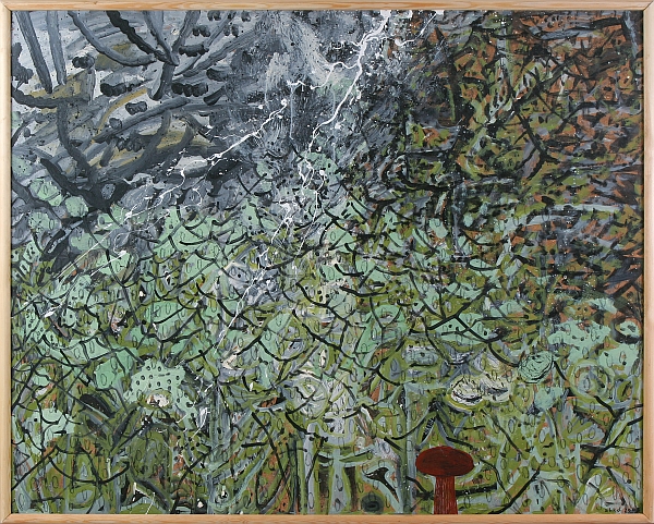 Krajina s dvìma blesky a høibem kováøem, akryl a uhel na sololitu, (95 x 120) cm, 2005, m. aut.